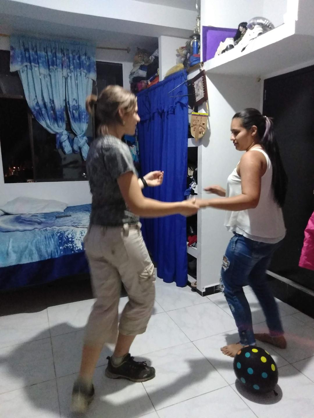 One of the sister’s cousins teachers Irene to salsa dance.
