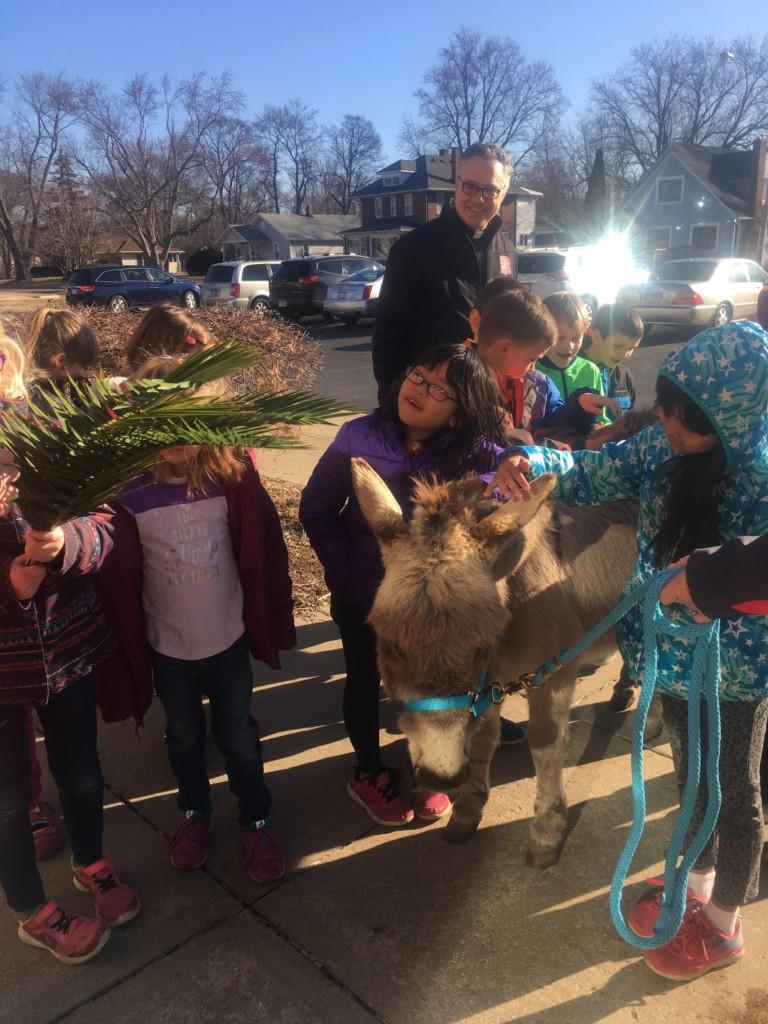 Fr. Chris and the Paul the Donkey came to the school before Palm Sunday.