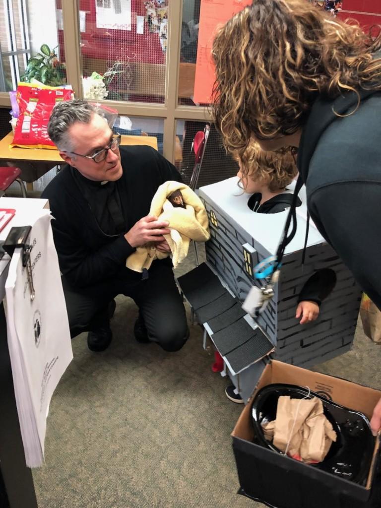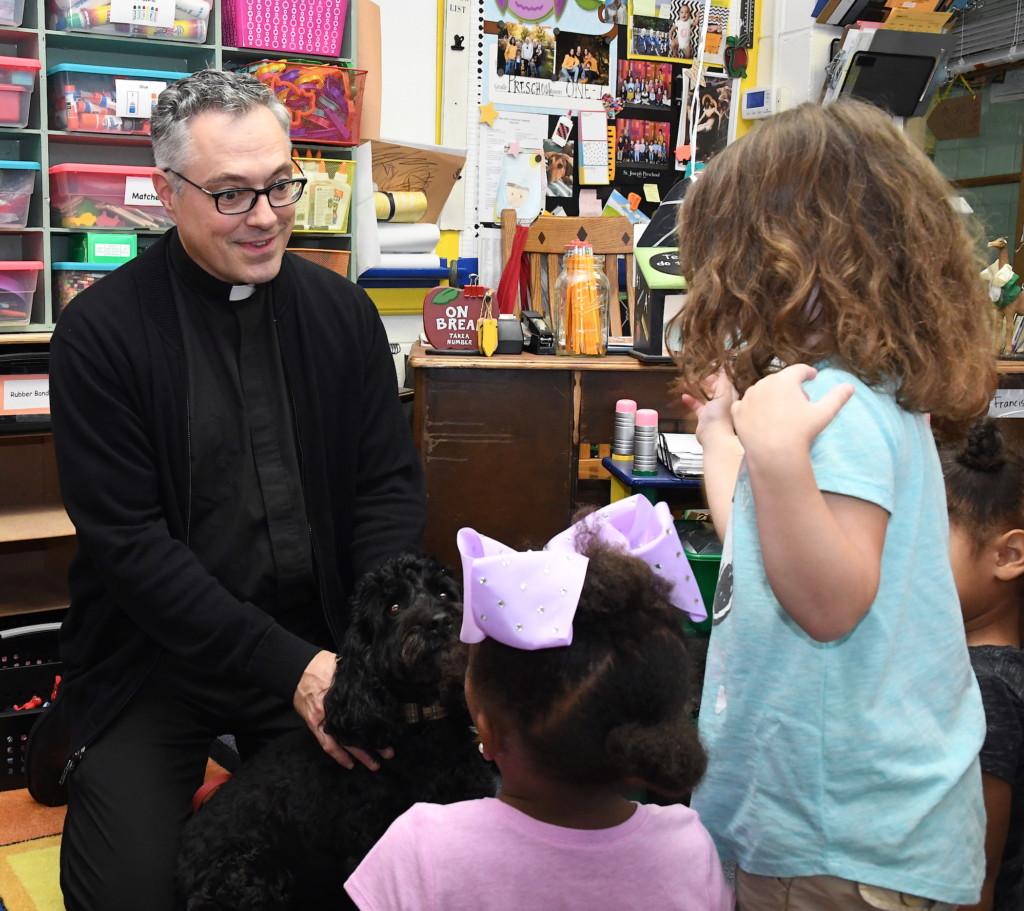 Fr. Chris and Edward visit the preschool. [Photo by John Grap; courtesy of the Diocese of Kalamazoo.]