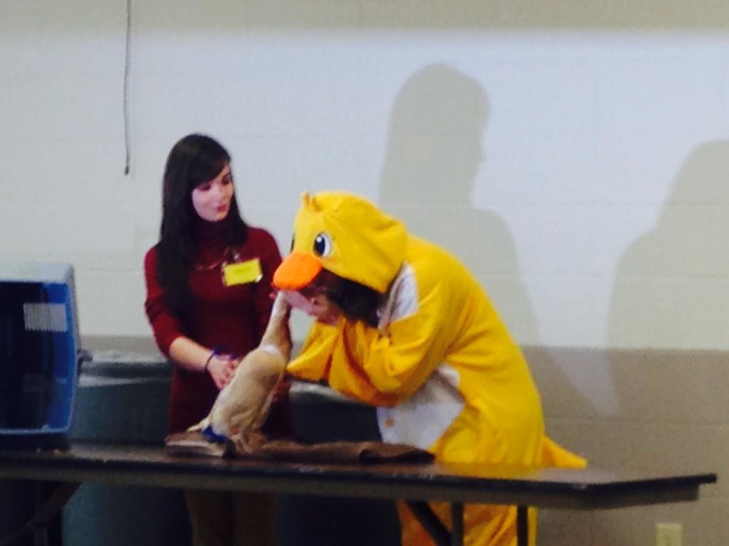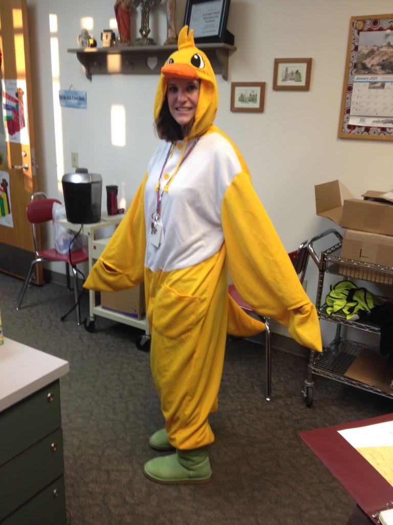 What Fr. Chris didn’t know, was Mrs. Myers isn’t a stranger to hosting feathered friends at school. She once kissed a duck, dressed as a duck.