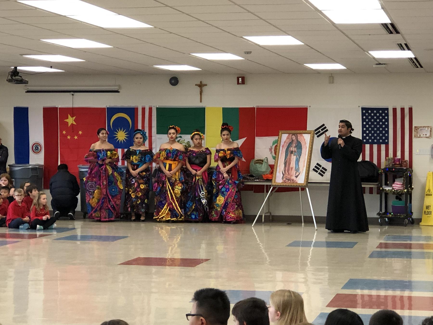 With that in mind, a portrait of Our Lady of Guadalupe was hung in the foyer of St. Joseph Elementary School. The administration hired Monika Rosas to be the school’s madrina – Spanish for “godmother” – who acts as a liaison to Hispanic families. Together with Ms. Rosas and Fr. Jose, the staff planned a special Our Lady of Guadalupe school celebration for December 12th.