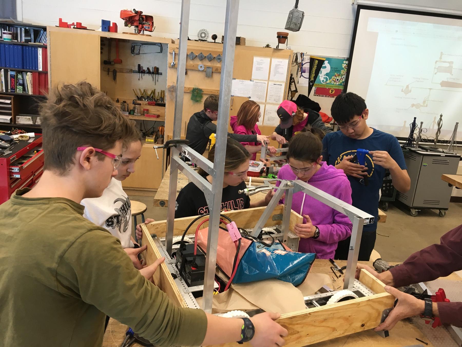 Robotics usually meets on Saturdays for Open Build Events. This gives both the Lakeview and STP team a chance to build their robots and discuss the competition. Because most of the St. Philip members are new to robotics, they are building the robot as one big group.