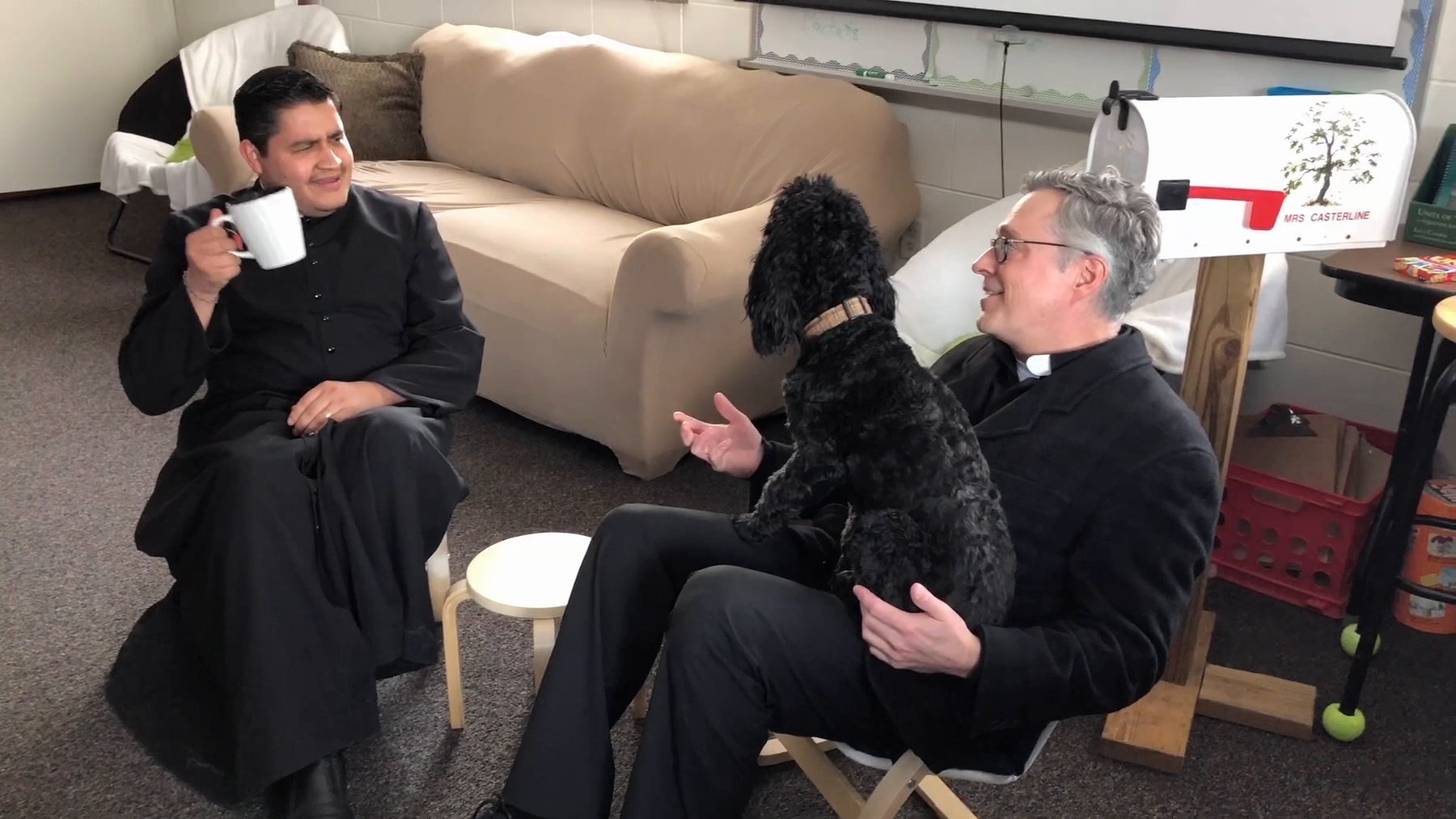 Upon learning their prayers were answered, the team of four, plus Fr. Chris’ dog, Edward, take off to enjoy the empty school.