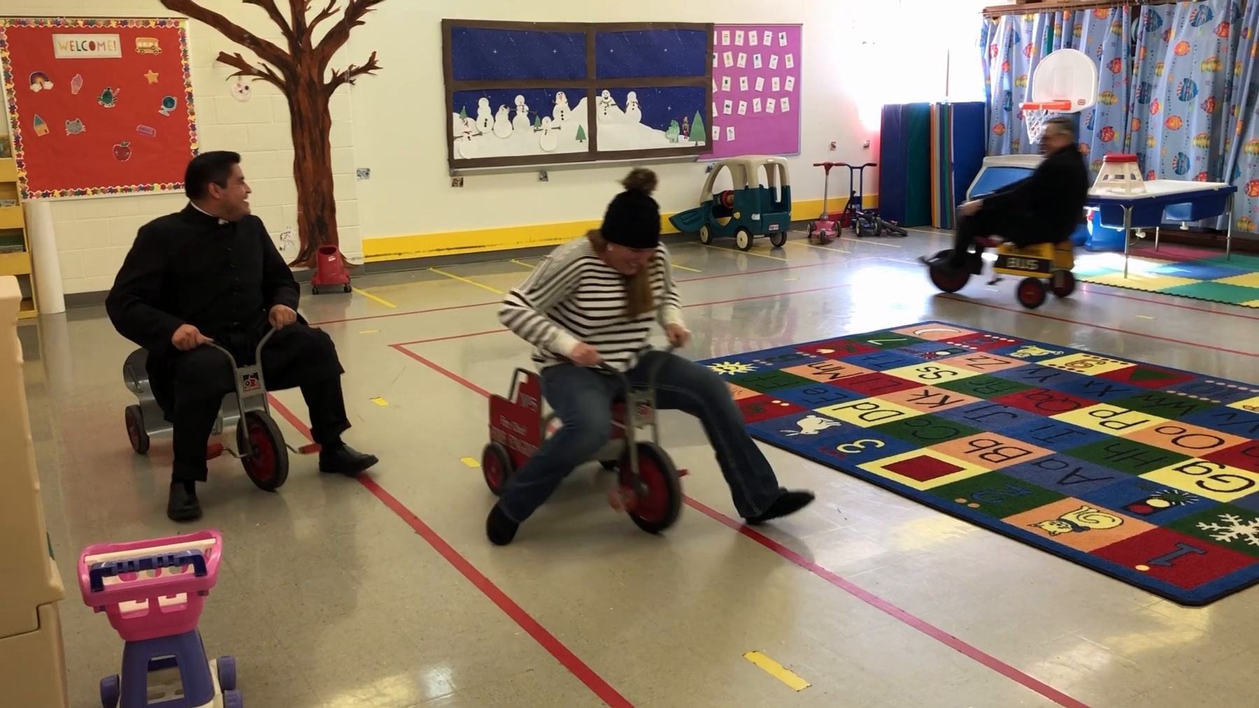 Mischief included raiding the snack shack, upsetting the library books, playing the band instruments, riding the preschool tricycles, sliding down the middle school banister, racing the gym scooters, and throwing pillows at Fr. José in Pillow Place, the music room’s special spot for good students.